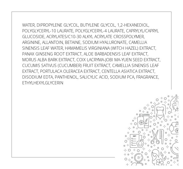 Ingredients: WATER, DIPROPYLENE GLYCOL, PEG/PPG-17/6 COPOLYMER, CAMELLIA SINENSIS LEAF WEAR, PANTHENOL, BETAINE, SODIUM HYALURONATE, 1,2-HEXANEDIOL, BUTYLENE GLYCOL, ACRYLATES/C10-30 ALKYL ACRYLATE CROSSPOLYMER, PEG-60 HYDROGENATED CASTOR OIL, BIS-PEG-18 METHYL ETHER DIMETHYL SILANE, HAMAMELIS VIRGINIANA (WITCH HAZEL) EXTRACT, PANAX GINSENG ROOT EXTRACT, ALOE BARBADENSIS LEAF EXTRACT, MORUS ALBA BARK EXTRACT, COIX LACRYMA-JOBI MA-YUEN SEED EXTRACT, CUCUMIS SATIVUS (CUCUMBER) FRUIT EXTRACT, CAMELLIA SINENSIS LEAF EXTRACT, PORTULACA OLERACEA EXTRACT, CANTELLA ASIATRICA EXTRACT, POTASSIUM HYDROXIDE, SODIUM PCA, HYDROLIZED COLLAGEN, ALLANTOIN, CAPRYLYL GLYCOL, ETHYLHEXYLGLYCERIN, FRAGRANCE,DISODIUM EDTA, XANTHAN GUM, SALICYLIC ACID