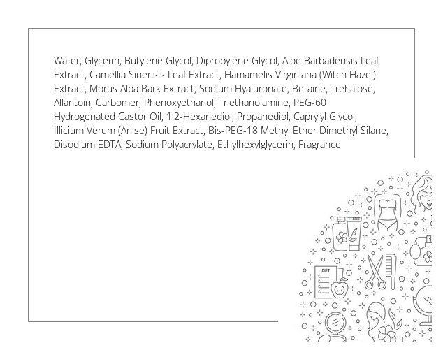 Ingredients: Water, Glycerin, Butylene, Glycol, Dipropylene Glycol, Carbomer, Aloe BarbadensisiLeaf Extract(10, 000ppm) Camellia Sinensis Leaf Extract, Hamamelis Virginiana (Witch Hazel) Extract, Morus Alba Bark Extract, Sodium Hyaluronate, Betaine, Trehalose, Allantoin, Phenoxyethanol, PEG-60 Hydrogenated Castor Oil, 1, 2-Hexanediol, Propanediol, Caprylyl Glycol, illicium Verum (Anise) Fruit Extract. Bis-PEG-18 Methyl Ether Dimethyl Silane, Disodium EDTA,Sodium Polyacrylate, Ethylhexylglycerin, Fragrance.