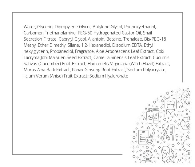 Ingredients: Water, Glycerin, Butylene Glycol, Dipropylene Glycol, Carbomer, Snail Secretion Filtrate (10,000ppm), Camellia Sinensis Leaf Extract, Hamamelis Virginiana (Witch Hazel) Extract, Aloe Barbadensis Leaf Extract, Morus Alba Bark Extract, Sodium Hyaluronate, Betaine, Trehalose, Allantoin, Phenoxyethanol PEG-60 Hydrogenated Castor Oil, 1,2-Hexanediol, Propanediol, Caprylyl Glycol, lllicium Verum (Anise) Fruit Extract, Bis-PEG-18 Methyl Ether Dimethyl Silane, Triethanolamine, Disodium EDTA, Sodium Polyacrylate, Ethylhexylglycerin, Fragrance