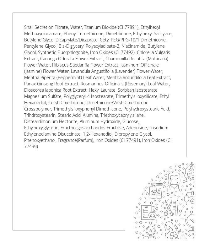 Ingredients WATER, CYCLOMETHICONE, TITANIUM DIOXIDE, ETHYLHEXYL METHOXYCINNAMATE, DIMETHICONE, GLYCERIN, BUTYLENE GLYCOL, BUTYLENE GLYCOL DICAPRYLATE/DICAPRATE, CETYL PEG/PPG-10/1 DIMETHICONE, TALC,NIACINAMIDE, DIPENTAERYTHRITYL HEXAHYDROXYSTEARATE/HEXASTEARATE/ HEXAROSINATE, ETHYLHEXYL SALICYLATE, ISOTRIDECYL ISONONANOATE, ZINC OXIDE, PRUNUS AMYGDALUS DULCIS (SWEET ALMOND) OIL, MAGNESIUM SULFATE, HEXYLDECYL MYRISTOYL METHYLAMINOPROPIONATE, DIMETHICONE/VINYL DIMETHICONE CROSSPOLYMER, VINYL DIMETHICONE/METHICONE SILSESQUIOXANE CROSSPOLYMER, TRIHYDROXYSTEARIN, POLYGLYCERYL-4 ISOSTEARATE, IRON OXIDES(CI 77492), CYCLOPENTASILOXANE, PHENOXYETHANOL, DISTEARDIMONIUM HECTORITE, IRON OXIDES(CI 77499), METHICONE, IRON OXIDES(CI 77491), ALUMINUM HYDROXIDE, ALUMINUM STEARATE, ACRYLATES/DIMETHICONE COPOLYMER, FRAGRANCE, ETHYLHEXYLGLYCERIN, PORTULACA OLERACEA EXTRACT, ADENOSINE, AMINOPROPYL DIMETHICONE, POLYMETHYLSILSESQUIOXANE, GOLD, LAURYL PEG-9 POLYDIMETHYLSILOXYETHYL DIMETHICONE, BORAGO OFFICINALIS SEED OIL, ARGANIA SPINOSA KERNEL OIL, CARNOSINE, HELIANTHUS ANNUUS (SUNFLOWER) SEED OIL, XYLITYLGLUCOSIDE, ANHYDROXYLITOL, CAPRYLIC/CAPRIC TRIGLYCERIDE, XYLITOL, UBIQUINONE, HYDROGENATED LECITHIN, ALGAE EXTRACT, CERAMIDE NP, CHOLESTEROL, TOCOPHERYL ACETATE, PALMITOYL TRIPEPTIDE-5, ASPALATHUS LINEARIS LEAF EXTRACT, BHT, CAVIAR EXTRACT, TOCOPHEROL