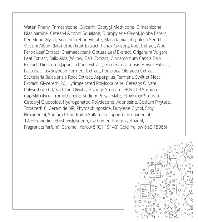 Skin79 Golden Snail is a completely new, luxurious anti-aging line for women who need strong regeneration, visible effects and maximum comfort when using the product. The three base ingredients of all cosmetics from the Golden Snail line are the highest quality filtration from the golden snail, which has regenerating, rejuvenating, smoothing, soothing and moisturizing properties. It is very effective in fighting imperfections. It slows down the aging process, supports the treatment of wounds and scarring. In addition, we find here the extract of red Korean ginseng, which smoothes the skin and adds vitality. It has renewing and regenerative properties. It is rich in vitamins, microelements and organic acids. It works strongly rejuvenating. 24 carat gold has an anti-wrinkle and brightening effect. Cream, which is based on a filtrate from the snail slime. A unique recipe that solves many skin problems. For all skin types, regardless of age, with visible signs of aging, for skin that requires nourishment and regeneration, flabby, tired, with wrinkles and discoloration. It stimulates fibroblasts to produce collagen. Helps to overcome imperfections, regulates the production of sebum. It increases the tension and firmness of the skin. It has a brightening effect, relieves pigmentation changes. The high content of niacin improves the lipid barrier of the epidermis, increases moistness and stimulates cell repair. Adenosine prevents the formation of mimic wrinkles as well as the collagen breakdown. The improved formula provides deep nutrition.